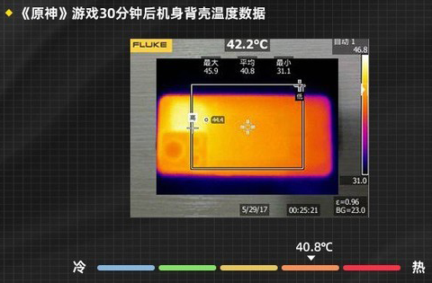 可以看到在運(yùn)行半小時(shí)后,機(jī)身平均溫度為40.8攝氏度。整個(gè)游戲過程中機(jī)身發(fā)熱處于可接受水平,如果關(guān)閉GT模式機(jī)身溫度還會(huì)進(jìn)一步降低。