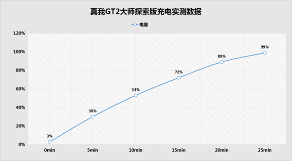 在快充實(shí)測中,我們可以看出,從3%的基礎(chǔ)電量開始,5分鐘即可充至30%,10分鐘便達(dá)53%電量,最終用時25分鐘39秒,前臺顯示100%電量,相信這樣一個充電速度,不管是碎片時間的快速回血,還是由零充滿的整體耗時,真我GT2大師探索版都可以處理得游刃有余。