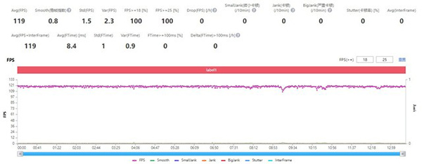 游戲畫面設(shè)置為極高120幀,分辨率設(shè)置為超高,打開抗鋸齒,連續(xù)打了15分鐘游戲。整體平均幀率為119幀。除了在死亡的一瞬間掉一兩幀,在平常的對(duì)線和團(tuán)戰(zhàn)當(dāng)中基本不會(huì)有波動(dòng)?!锻跽邩s耀》大家無(wú)需擔(dān)心,Reno8 Pro+完美駕馭。