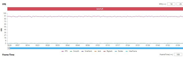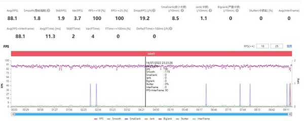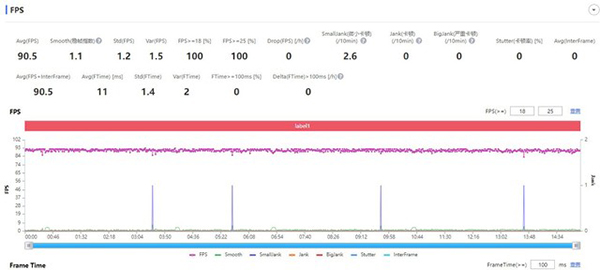 一共玩了3把排位,大家看一下幀率圖,全場(chǎng)平均幀率90.5幀,穩(wěn)幀指數(shù)1.1,幀率穩(wěn)成一條直線,非常穩(wěn)。