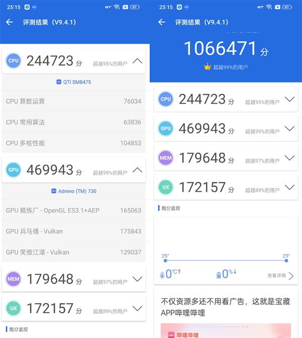 當(dāng)然,在性能環(huán)節(jié)自然是少不了跑分測(cè)試,畢竟這是檢驗(yàn)性能的最好方式。在實(shí)際的安兔兔跑分測(cè)試中,真我GT2大師探索版跑到了1066471分的成績(jī),輕輕松松就突破了一百萬(wàn)分的成績(jī)。