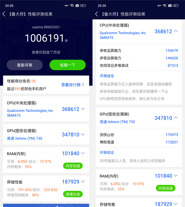 在魯大師跑分測(cè)試中,同樣是跑出了破百萬(wàn)分的成績(jī),都是在常溫環(huán)境下進(jìn)行跑分,并未使用其它輔助工具。這樣的跑分成績(jī),足以證明真我GT2大師探索版的實(shí)力表現(xiàn)。