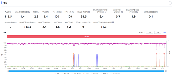 小米12 Pro天璣版在進(jìn)行《王者榮耀》測(cè)試時(shí),在120幀率下開啟最高畫質(zhì),游玩將近10分鐘,平均幀率在118.5FPS,整體波動(dòng)并不算大。