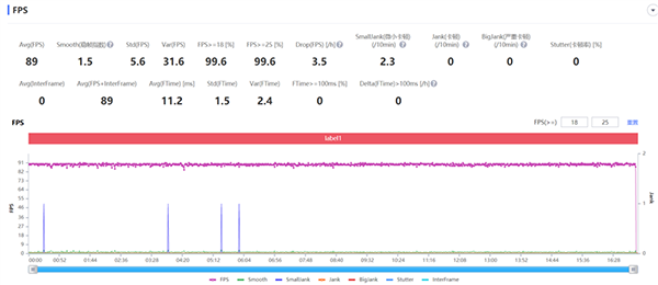 在進(jìn)行《和平精英》游戲測(cè)試時(shí),開啟流暢畫質(zhì)+最高90幀畫面,游玩近15分鐘,游戲幀率完全保持在一條直線上,平均幀率為89FPS,接近滿幀運(yùn)行。