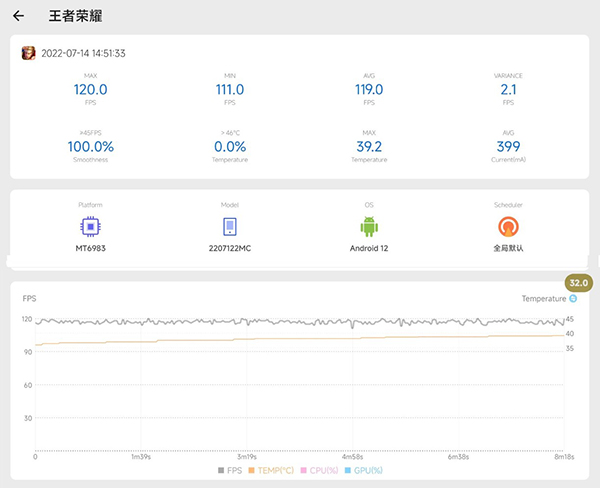 首先是《王者榮耀》,目前這三款小米產(chǎn)品均已經(jīng)適配了各家主流游戲的高幀率模式,我們將畫質(zhì)調(diào)至最高,幀率設(shè)定為120FPS。在接近20分鐘的游戲過程中,小米12 Pro天璣版的表現(xiàn)十分穩(wěn)定,測(cè)試曲線十分平滑,在游戲過程中沒有卡頓的現(xiàn)象,表現(xiàn)很不錯(cuò)。