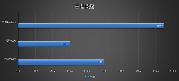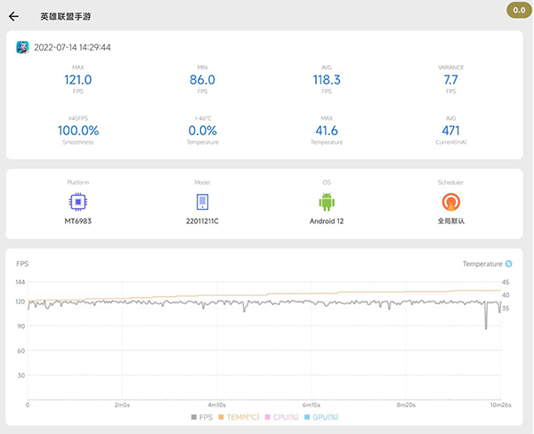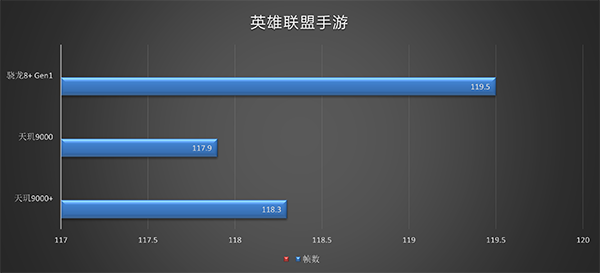 在英雄聯(lián)盟手游中,我們直接利用外部工具將三款產(chǎn)品的游戲幀率設(shè)置在120幀。一局20分鐘左右的大亂斗結(jié)束之后,實(shí)測(cè)這顆天璣9000+的平均幀率為118.3幀,幀率曲線幾乎為一條直線,只有角色死亡和團(tuán)戰(zhàn)會(huì)出現(xiàn)輕微掉幀的情況,功耗則在5.5W左右。
