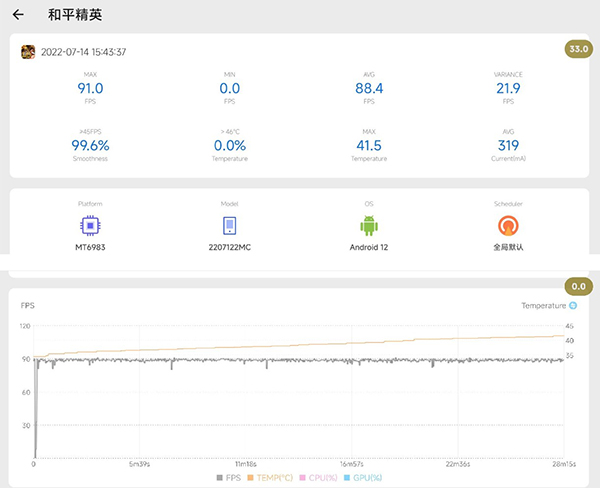 從實(shí)測(cè)幀率上我們也可以看出,目前《王者榮耀》對(duì)旗艦手機(jī)基本已經(jīng)沒有壓力,而整機(jī)≤40度的溫度和不到3.5W的功耗表現(xiàn),也證明了天璣9000+的能耗比表現(xiàn)十分不錯(cuò)。