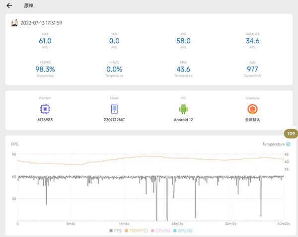 實(shí)際體驗(yàn)下來,小米12 Pro天璣版在前16分鐘基本能保持在60幀左右運(yùn)行,16分鐘之后開始出現(xiàn)幀數(shù)波動(dòng)的情況,但是整體幀數(shù)依然能夠維持在60幀上下,最終40分鐘測(cè)試下來平均幀數(shù)為58幀,機(jī)身背面最高溫度達(dá)到45.2度,整機(jī)功耗最高可達(dá)7.5W左右。