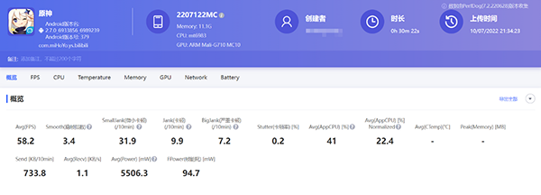 通過Perfdog記錄的測試數(shù)據(jù)如下。平均幀數(shù)58.2幀,平均功耗5.5W,機(jī)身正面最高45.4℃,背面最高43.5℃。可見在天璣9000+的加持下,小米12 Pro天璣版在可接受的功耗和發(fā)熱范圍內(nèi)獲得了相當(dāng)穩(wěn)定流暢的游戲體驗(yàn)。