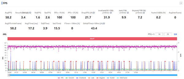 而觀察全過程中的CPU變化,可見天璣9000+的調(diào)頻最高可達(dá)2.2GHz,可見要比此前天璣9000要更加靈活,因而幀數(shù)有進(jìn)一步的提升。至于幀數(shù)圖上顯示的間歇性瞬時(shí)卡頓,在以往測試過的所有平臺(tái)上都有出現(xiàn),暫時(shí)無解,因此也不必吹毛求疵。