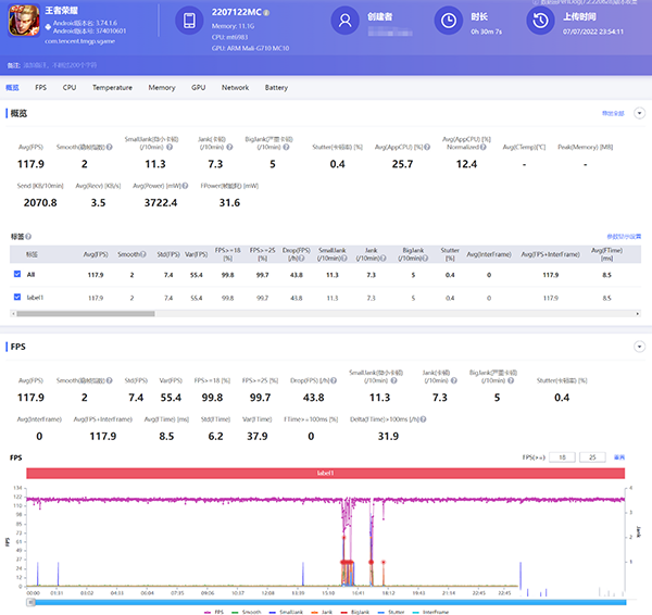 而玩家更多更廣泛的游戲王者榮耀,因?yàn)槟壳岸鄶?shù)旗艦機(jī)型普遍都只能開到高清畫質(zhì)+120幀,因而壓力偏小,同時(shí)實(shí)際游戲的壓力也和玩家的游戲習(xí)慣(比如是否喜歡團(tuán)戰(zhàn))緊密相關(guān),導(dǎo)致在不通人群中的隨機(jī)性較大,進(jìn)而測試成績的價(jià)值相對就沒那么高了。實(shí)測5V5匹配連續(xù)兩局包括中間游戲大廳過場,平均117.9幀,每局游戲過程中都接近120滿幀,幀圖基本是條直線,功耗3.72W,機(jī)身最高溫度40.1℃,可見對天璣9000+而言基本毫無壓力。