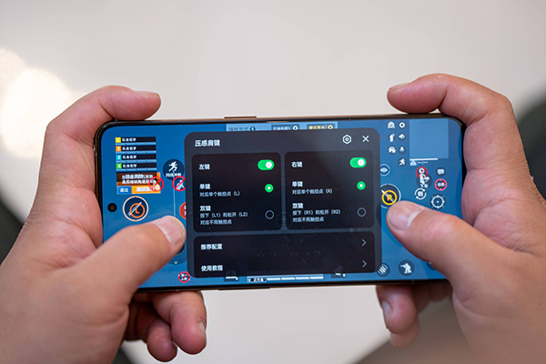 既然聊到了這里,我發(fā)現(xiàn)游戲助手內(nèi)還有一個小彩蛋,那就是壓感肩鍵功能,它支持單鍵、雙鍵兩種映射方式,最多支持四個觸控鍵位,要是不知道怎么設置的小伙伴,可以使用系統(tǒng)推薦的。另外,這次的游戲肩鍵跟以往的不同,它是隱藏式的,如果不是玩游戲,壓根發(fā)現(xiàn)不了它;更要命的是,玩游戲的時候還要去適應一下,因為第一次玩肯定會拿捏不準肩鍵的位置。
