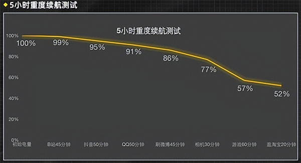 為了更直觀感受iQOO 10 Pro的續(xù)航表現(xiàn),筆者對(duì)其進(jìn)行了5小時(shí)重度續(xù)航測(cè)試,在當(dāng)前室溫環(huán)境下,連接辦公室Wi-Fi,關(guān)閉藍(lán)牙定位,屏幕亮度、音量均設(shè)為50%,其結(jié)果如下: