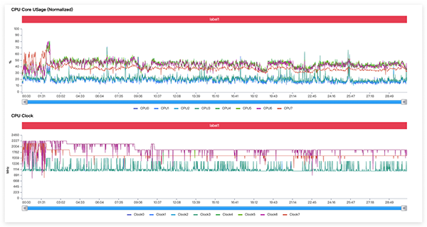 如下圖所示,在30分鐘的游戲中,驍龍8+的Cortex-X2超大核心(主頻3.2GHz)基本保持在1.7Ghz左右;3個(gè)Cortex-A710中核心(主頻2.75GHz)在1.9Ghz上下波動(dòng)。