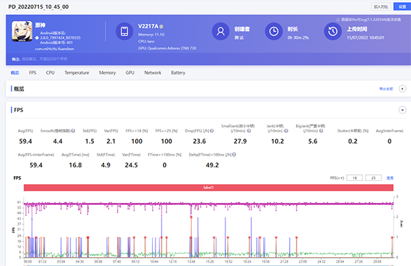 這在跑分成績(jī)和游戲體驗(yàn)上都反映了出來(lái),實(shí)測(cè)安兔兔跑分108萬(wàn)多。室溫原神測(cè)試30分鐘左右,平均幀率59.4,整個(gè)游戲過(guò)程中基本上全程都是滿幀運(yùn)行,效果比預(yù)期好上一大截。