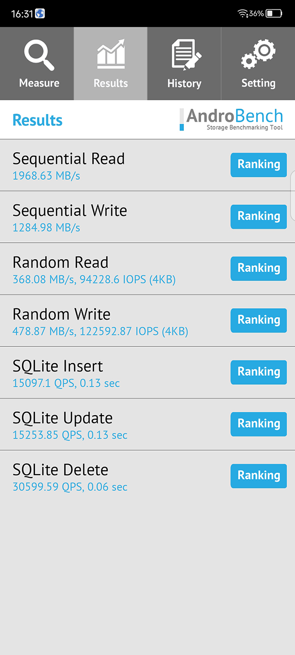其次是AndroBench環(huán)節(jié),這一環(huán)節(jié)主要是測(cè)試手機(jī)的閃存速度如何,閃存速度與應(yīng)用開啟速度、加載速度以及文件傳輸速度有著不可分割的關(guān)系。在這一環(huán)節(jié)中,努比亞Z40S Pro的成績(jī)還算不錯(cuò),具體如下: