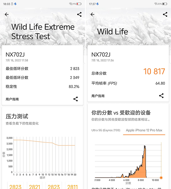 第三個(gè)環(huán)節(jié)是3D Mark的“WILD LIFE”項(xiàng)目,該項(xiàng)目主要測(cè)試手機(jī)在高負(fù)載情況下的平均運(yùn)行流暢度及穩(wěn)定性如何。從數(shù)據(jù)圖中可以看到,努比亞Z40S Pro的跑分成績(jī)?yōu)?0817分,平均幀率為64.8。而在長(zhǎng)達(dá)20分鐘的高負(fù)載穩(wěn)定性測(cè)試環(huán)境中,其穩(wěn)定性達(dá)到了83.2%,整體表現(xiàn)還算不錯(cuò)。
