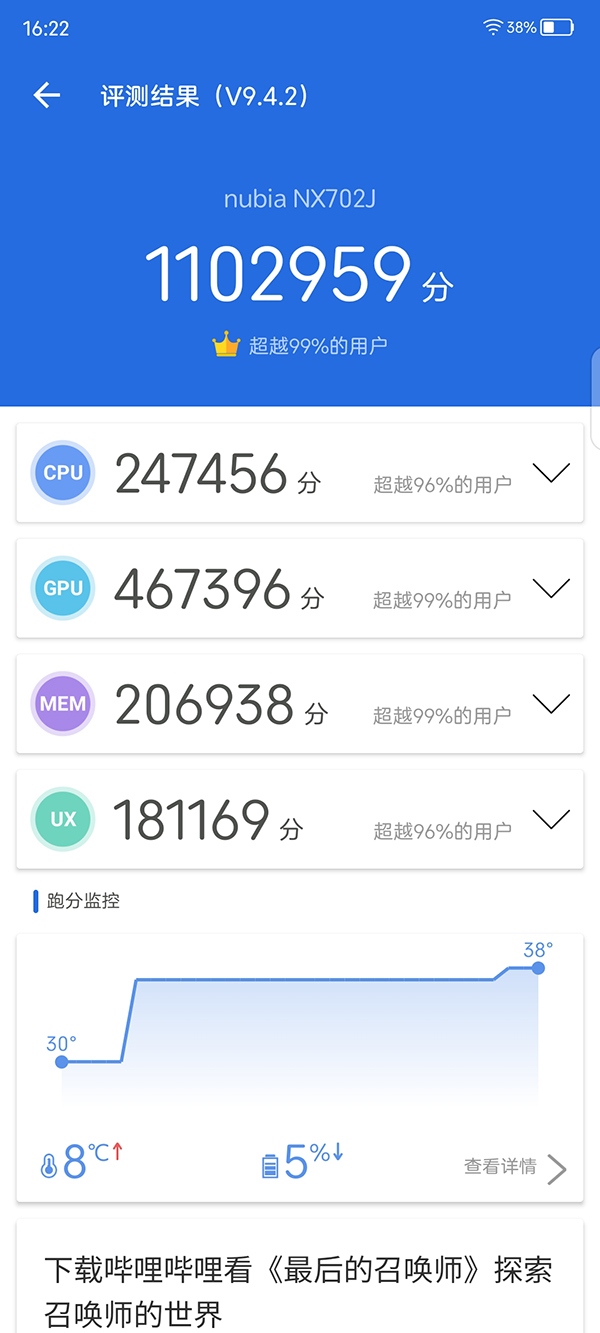 最后一個(gè)環(huán)節(jié)是大家的老朋友安兔兔跑分測(cè)試,雖然很多人都覺(jué)得安兔兔跑分就圖一樂(lè),但它畢竟是市面上為數(shù)不多測(cè)試項(xiàng)目較為全面的一款軟件。在這一環(huán)節(jié)中,努比亞Z40S Pro輕松跑出了1102959分的成績(jī),這個(gè)分?jǐn)?shù)是我近期測(cè)試的手機(jī)中數(shù)據(jù)最好的一個(gè)。