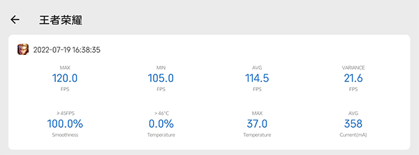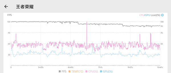 首先是王者榮耀,作為真正的國民級手游,它對手機的優(yōu)化做得相當(dāng)出色,別說驍龍8+Gen1了,哪怕是幾年前的驍龍855也能夠流暢運行。將畫質(zhì)調(diào)至最高,并將幀率調(diào)至120FPS后,從幀率圖中可以看到努比亞Z40S Pro的表現(xiàn)相當(dāng)穩(wěn)定,全程穩(wěn)定在110幀以上,掉幀的情況極少。