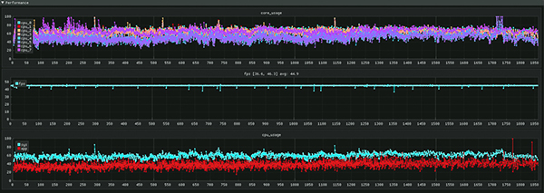 首先是《王者榮耀》,游戲內(nèi)選擇超高幀率,超高分辨率,打開(kāi)抗鋸齒,高清畫(huà)面總質(zhì)量,進(jìn)入游戲后打開(kāi)游戲插幀功能(游戲插幀功能要求手機(jī)屏幕分辨率調(diào)整至2400×1080),這時(shí)雖然游戲以及測(cè)試軟件內(nèi)顯示是60fps,但實(shí)際幀率是120fps。通過(guò)幀率曲線(xiàn)我們依然可以看到游戲是否有掉幀等情況??梢钥吹健锻跽邩s耀》這類(lèi)游戲運(yùn)行還是很穩(wěn)的,基本就是一條直線(xiàn)沒(méi)有什么波動(dòng)。那試試負(fù)載更高的《原神》呢?