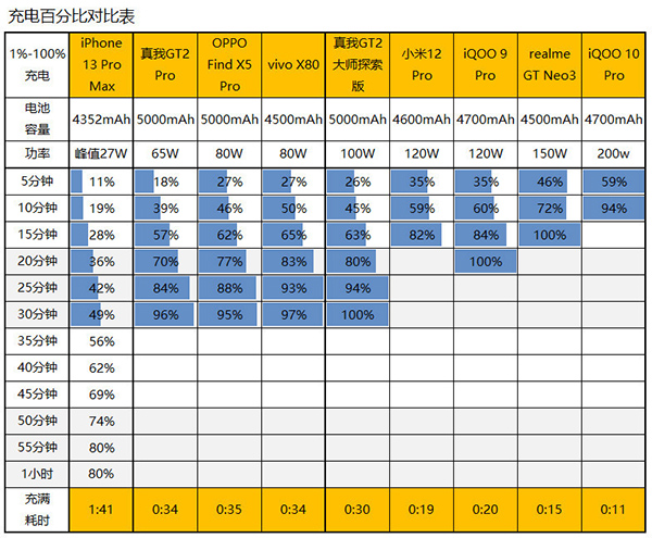 以日常通勤為例,臨出門發(fā)現(xiàn)電量不夠,如果要從10%充到40%。那iQOO 10 Pro完成這個(gè)區(qū)間的充電要2分鐘出頭,而150W的realme要4分鐘左右,常見的65W級(jí)快充要8分鐘,峰值27W就“超速”的iPhone 13 Pro Max要超過20分鐘……
