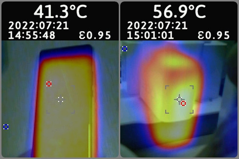 室溫25度,65%濕度,充電早期,升溫最快的是充電線的線頭,4分鐘漲到46度,隨后被充電頭超越。6分鐘,充電頭到達(dá)53.4度,10分鐘達(dá)到最高溫60.4度,11分鐘斷充并回落到57度。
