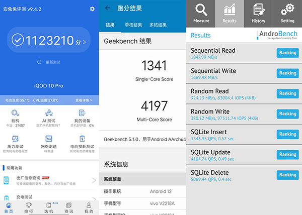 安兔兔測試結(jié)果表明,iQOO 10 Pro綜合成績1123210分,Geekbench5實測驍龍8+單核成績1341分,多核成績4197分,整體表現(xiàn)遠(yuǎn)超上半年的驍龍8機(jī)型。Androbench實測iQOO 10 Pro順序讀寫成績分別為1847MB/s、1669MB/s,我晚上回家打游戲時習(xí)慣性切換軟件刷抖音,順帶微信回復(fù)好友消息,相互之間切換使用很流暢,基本都能實現(xiàn)熱啟動。