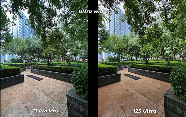 除了地磚的顏色有區(qū)別之外,綠化帶的樹木在色彩表現(xiàn)效果上,小米12S Ultra拍攝的樹木色彩更加鮮艷同時也非常明亮,而iPhone13 Pro Max拍攝的樹木在色彩上則暗淡無光。