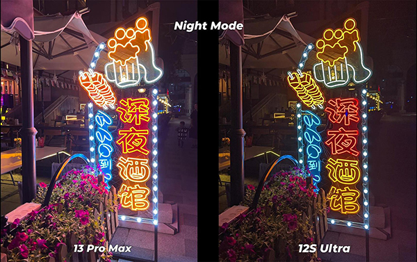 夜景照片最主要的評判標準,還是拍攝出來的照片中,發(fā)光物體的曝光程度是否控制的很好,還有顏色是否還原的真實。從這組夜景拍攝的照片中,可以看出來iPhone13 Pro Max和小米12S Ultra之間的區(qū)別。