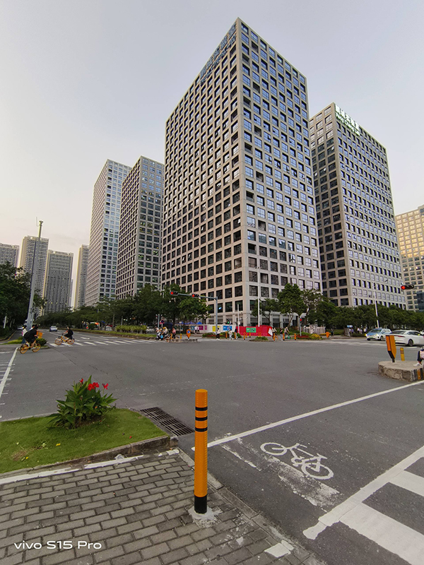 超廣角模式下,vivo S15 Pro有著116°取景范圍,地面斑馬線、建筑樓層、天空很容易被收納進(jìn)手機(jī)鏡頭,很適合用來拍攝宏偉的建筑和全景照片。仔細(xì)觀察可以發(fā)現(xiàn)超廣角鏡頭的成像風(fēng)格與主攝鏡頭很接近,近處的欄桿、草坪,遠(yuǎn)處的天空、玻璃色彩呈現(xiàn)準(zhǔn)確,但受限于硬件條件畫面解析力有限,對大多數(shù)消費(fèi)者來說肉眼觀感還是有保障的。