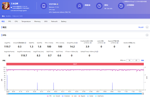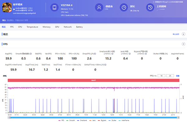 首先,《王者榮耀》《和平精英》這兩款高人氣游戲在我看來(lái)有點(diǎn)“殺雞焉用牛刀”的感覺(jué)。其中《王者榮耀》游戲幀率119.7FPS,幀率波動(dòng)0.3,《和平精英》游戲幀率59.9FPS,幀率波動(dòng)0.5,兩款游戲的幀率曲線圖基本處于一條直線運(yùn)行。