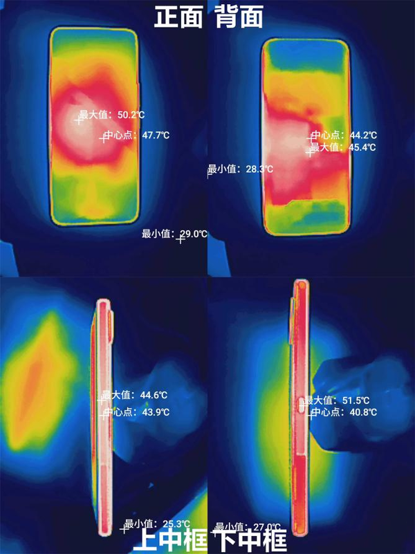 在發(fā)熱這塊也控制的比較好,正面、背面以及上下中框熱的地方不到43℃,而且主要集中在我們橫向握持手機(jī)玩游戲不太能碰到的地方,整體給人的感覺(jué)就是溫而不熱。