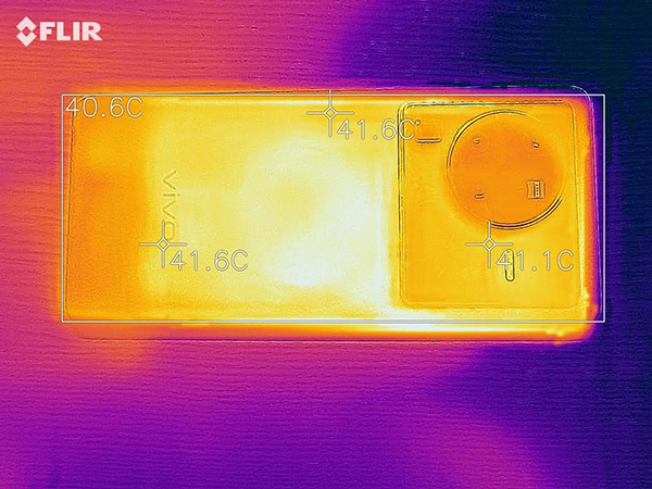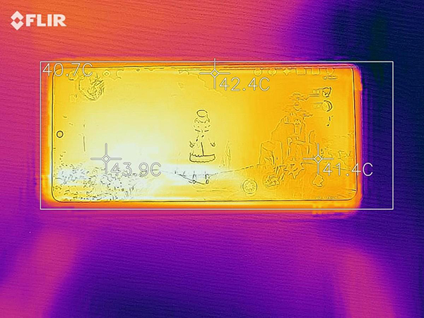 在游戲結(jié)束后,我也使用Flir One Pro紅外熱像儀測量了手機正面和背面的溫度,可以看到X80 Pro的正面最高溫度已經(jīng)來到了44度左右,背面溫度最高也達到了43度的水平,結(jié)合這臺手機的幀率表現(xiàn)來看,這個溫度表現(xiàn)并不算好,導(dǎo)致的原因大概是因為手機背部的相機模組占用了相當大的面積,散熱模組并不能像游戲手機一樣做的非常大。