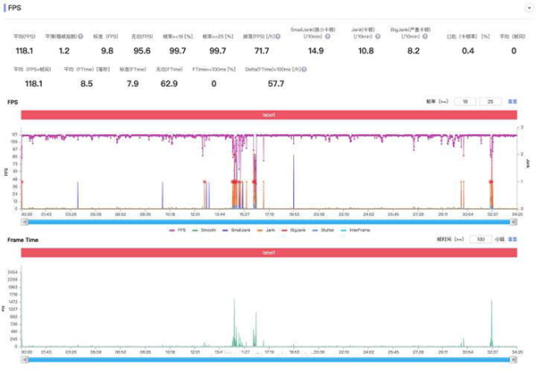 講完理論,還是得實(shí)操一下。結(jié)果坑爹的事情發(fā)生了,之前用的所有幀率記錄軟件全部都失效了,迫于無(wú)奈我只能腆著老臉去朋友那里PY了一個(gè)性能狗。先上個(gè)半小時(shí)王者榮耀,高畫(huà)質(zhì)極限幀率,120幀順利開(kāi)啟,絕大多數(shù)場(chǎng)景下120幀都能夠順利跑滿,但是在大規(guī)模團(tuán)戰(zhàn)的時(shí)候,還是會(huì)有一定的掉幀情況出現(xiàn),但都能維持在90幀以上,不會(huì)有卡頓的感覺(jué)。(中間大范圍幀率波動(dòng)是打完一局之后的過(guò)場(chǎng)動(dòng)畫(huà),可以忽略)