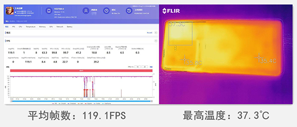 游戲場景進(jìn)步相當(dāng)明顯,25℃室溫環(huán)境下,30分鐘《王者榮耀》120幀模式,除了加載和退出對局出現(xiàn)不可避免的掉幀情況外,幀數(shù)基本保持在滿幀狀態(tài),平均幀數(shù)直接來到119.1FPS。1小時(shí)后測得機(jī)身最高溫度37.3℃,溫控能力出色。