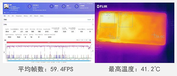 而在《原神》高畫質(zhì)以及60幀的模式下,30分鐘幀數(shù)依舊穩(wěn)定,測得59.4FPS的平均幀數(shù),直到臨近結(jié)束時(shí)幀數(shù)才出現(xiàn)明顯波動(dòng)。1小時(shí)候測得機(jī)身最高溫度41.2℃,表現(xiàn)同樣不錯(cuò)。