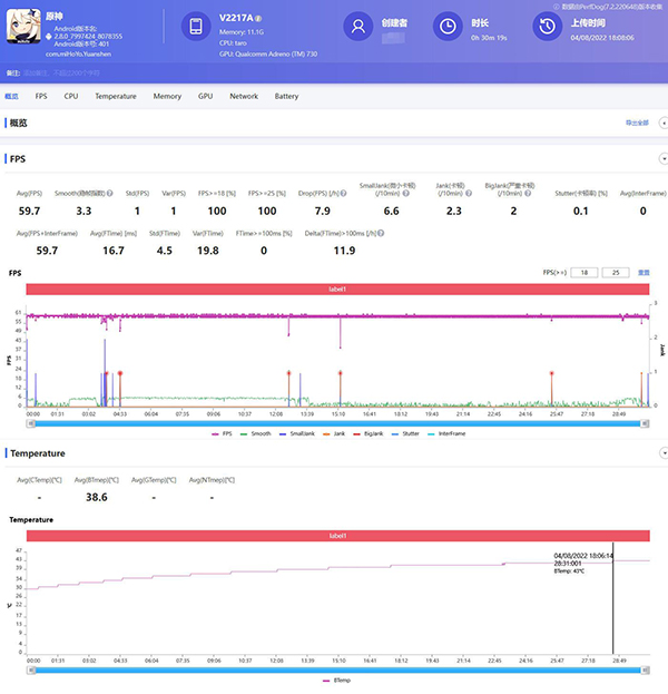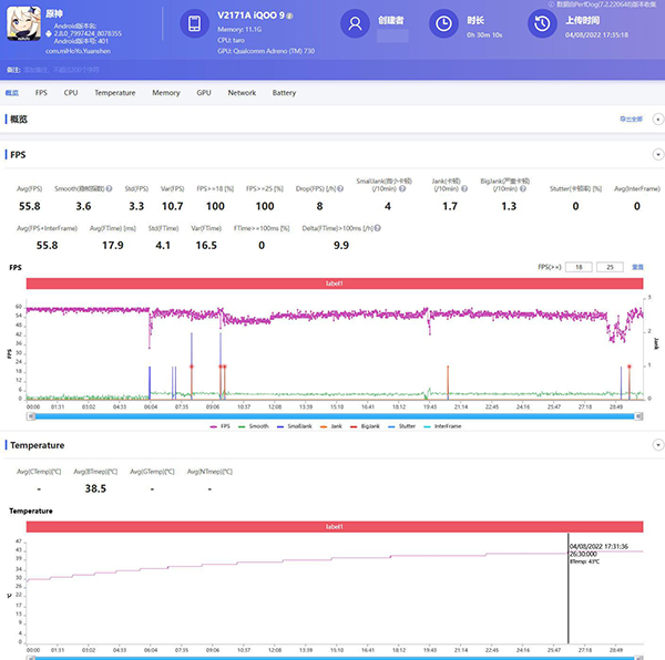 溫度方面,iQOO 10平均溫度僅為38.6攝氏度,游戲進(jìn)行到28分鐘30秒時溫度達(dá)到最高,為43攝氏度。而iQOO 9的平均溫度平均溫度為38.5攝氏度(iQOO 9起始溫度比iQOO 10低了1攝氏度,故平均溫度更低),在游戲進(jìn)行到26分鐘30秒時溫度達(dá)到43攝氏度。