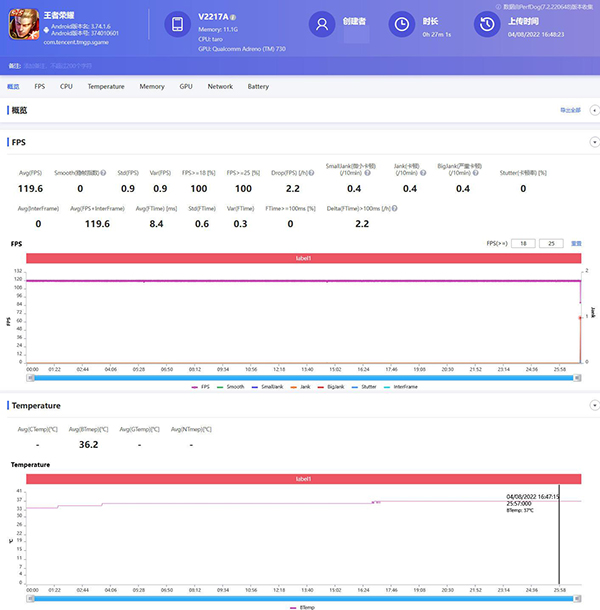 在約30分鐘的王者榮耀幀率測試中,iQOO 10的平均幀率為119.6FPS,iQOO 9的平均幀率為119.5FPS。兩者都實現(xiàn)了滿幀率運(yùn)行,但iQOO 10游戲最高溫度僅為37攝氏度,比iQOO 9低了2攝氏度,長時間游戲的體驗會更好一些。