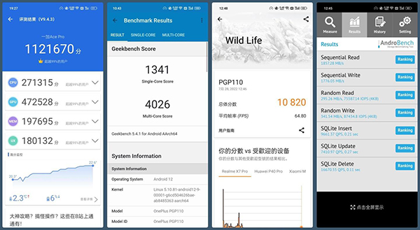 閃存性能測試中,一加Ace Pro的寫入速度達到了1857MB/s,讀取速度也到達了1776MB/s,UFS3.1的頂級水準;