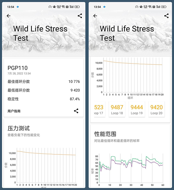 3DMark的Wild Life Stress Test項目中,一加Ace Pro獲得了87.4%的穩(wěn)定性,表現(xiàn)相當堅挺,這個成績,甚至比iQOO 10 Pro的85.2%還要略高一丟丟。由此證明,相較于驍龍8,全新的驍龍8+功耗確實有所下降,在連續(xù)20輪的測試中,進一步的減少了因發(fā)熱導致的降頻(分數(shù)急劇下降)問題。