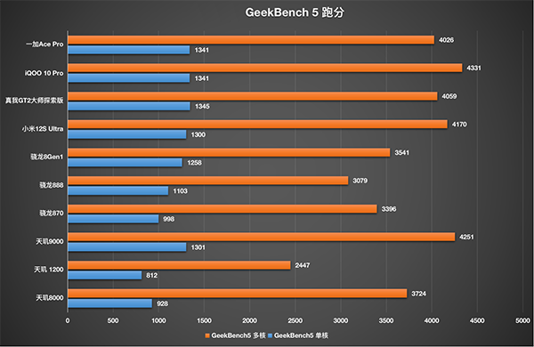 GeekBench5跑分方面,一加Ace Pro單核為1341分,多核達到了4026分,整體表現(xiàn)符合驍龍8+的水準。