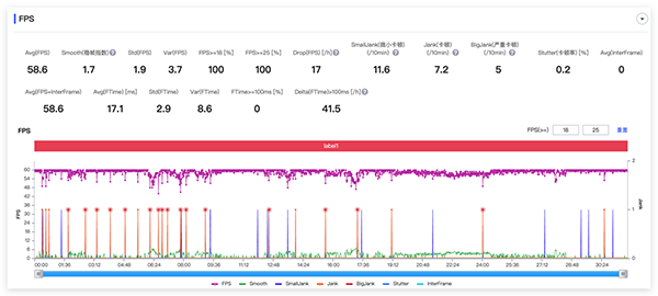 如下圖所示,一加Ace Pro平均幀率達到了58.8fps,穩(wěn)幀指數(shù)僅為1.7(越低越好,一般游戲類 < 8):