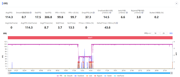 接下來是《王者榮耀》的極高幀率+極致畫質(zhì)模式,同樣是25度的室溫,半小時后平均幀率為117.4幀。同樣的,幀率表中間掉幀部分是游戲結(jié)束后換局的準(zhǔn)備環(huán)節(jié)??傮w的表現(xiàn)也是與《英雄聯(lián)盟手游》的體驗基本相同,第一局后半部分爆發(fā)了一場8人團戰(zhàn),在幀率表上有一個小波動,但在體驗上也沒有出現(xiàn)卡頓的情況。