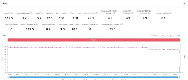 《QQ飛車(chē)》手游在開(kāi)啟高幀率與高畫(huà)質(zhì)模式下,在游戲內(nèi)能夠保持在120FPS的畫(huà)面輸出,一局游戲幀率穩(wěn)定,不過(guò)由于局外會(huì)掉60幀,我們只放入游戲內(nèi)幀率圖,平均幀率可達(dá)到115.5FPS。