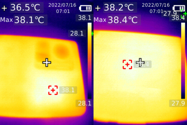 進(jìn)入溫度測(cè)試環(huán)節(jié),并經(jīng)過(guò)三輪的《QQ飛車(chē)》手游測(cè)試,摩托羅拉X30 Pro正面最高溫度38.4攝氏度,背面最高溫度38.1攝氏度,手機(jī)整體來(lái)說(shuō)只有溫溫的感覺(jué)。