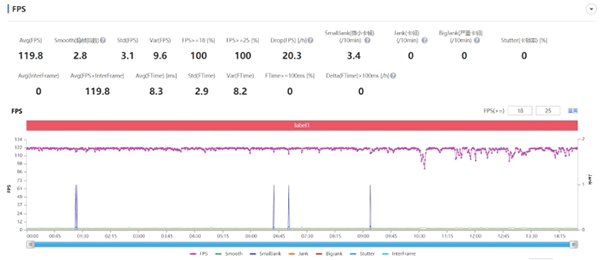 不過(guò),整體平均幀率達(dá)到了119.8FPS。全程接近滿幀運(yùn)行,驍龍8+發(fā)揮十分穩(wěn)定。