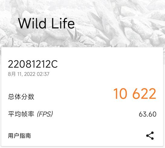在3D Mark Wild Life測試中,分?jǐn)?shù)為10622分。