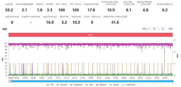 憑借著性能模式下寬松的溫控策略,K50至尊版的長時間游戲性能釋放非常充沛。實際進(jìn)行1小時的最高畫質(zhì)《原神》游戲,平均幀率達(dá)到59.2fps。在測試末期隨著手機(jī)熱量累積至飽和,游戲幀率會有輕微的波動,不過整體幀率依舊保持在57fps以上。