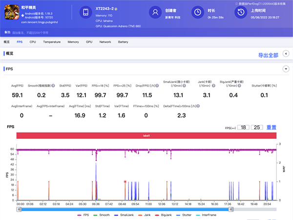 游戲?qū)崪y(cè)和平精英游戲開(kāi)啟HDR高清+極限幀率一局25分鐘,全程都能穩(wěn)定在59幀左右沒(méi)有太大浮動(dòng),機(jī)身溫?zé)?,游戲依舊流暢。