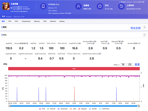 王者榮耀也同樣如此,超高分辨+極高幀率+高清畫(huà)質(zhì)的情況下,一局游戲21分鐘全程下來(lái)幀率都能穩(wěn)定在118.5幀左右,幀率穩(wěn)成一條直線,機(jī)身比吃雞游戲時(shí)的溫度還要低一點(diǎn)點(diǎn)。